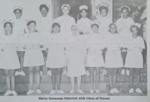The Nursing School was officially opened by Sister Mary Kateri with two classes of twenty students each. Sr. Kateri had to return to the U.S.A at the end of the year and was replaced by Sr. Mary Generosa who spent almost two decades in charge of the Nursing School. Under her training, the school had a great many successes. The percentage of passes at the Nurses State Final Examination never being less than 90%; these nurses have been of every race and creed and have served Guyana in many other parts of the world.